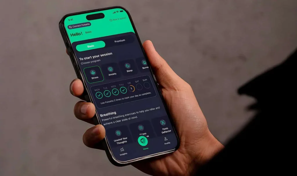 You place it around your neck, open the app, pick a mode (Anxiety, Stress, Pain Control, Sleep or Burnout), and let it run for about 10 minutes.