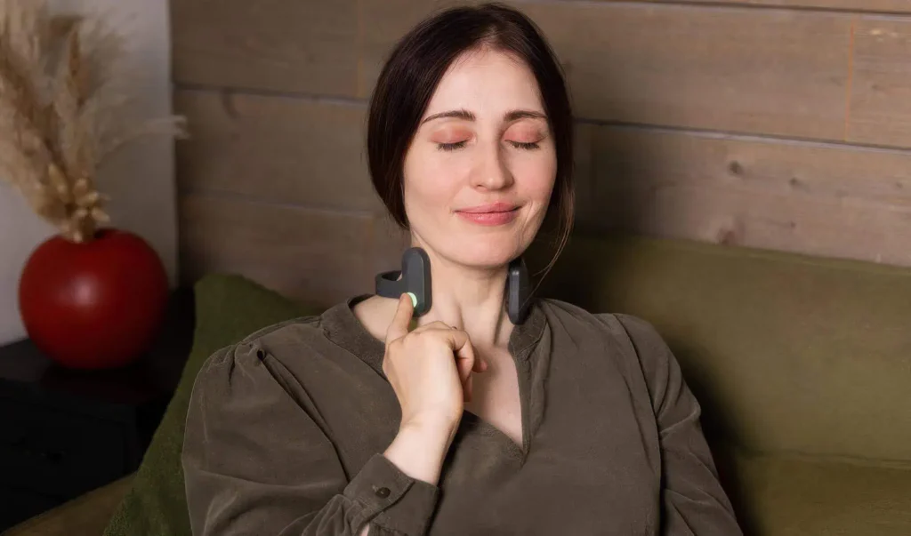 It’s a wearable vagus nerve stimulator that helps calm your nervous system using gentle electrical pulses.
